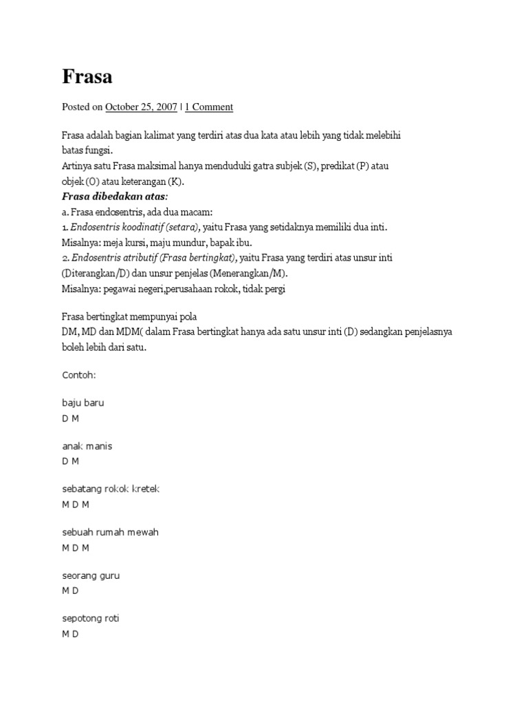 Dalam kamus besar bahasa indonesia frasa diartikan sebagai gabungan dua kata atau lebih dan memiliki sifat non predikatif. Meja hijau pesanan pak anwar. Jenis frasa yang tergolong dalam kelompok ini adalah frasa biasa frasa idiomatik dan frasa ambigu.