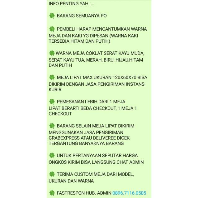 Khusus brg ini kami tidak terima pembelian tolak proses pengiriman kurir go grab sameday instant corier dan kurir sicepat disarankan pakai cargo. Jne bagi yg di luar kota bisa pakai kurir jne trucking dan rex biaya lumayan murah spesifikasi brg ukuran box akuratnya. Kaki meja terbuat dari bahan besi dapat di lipat.