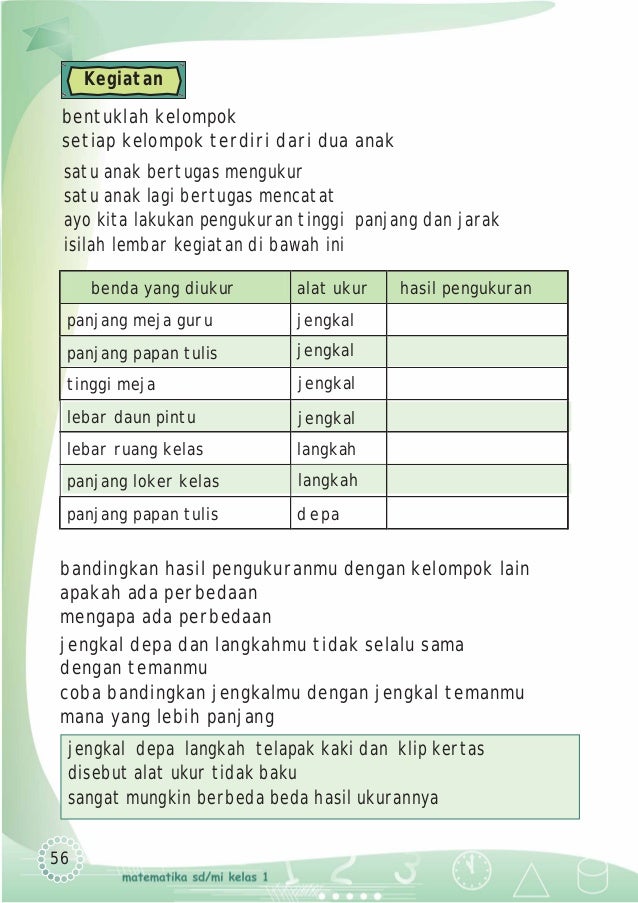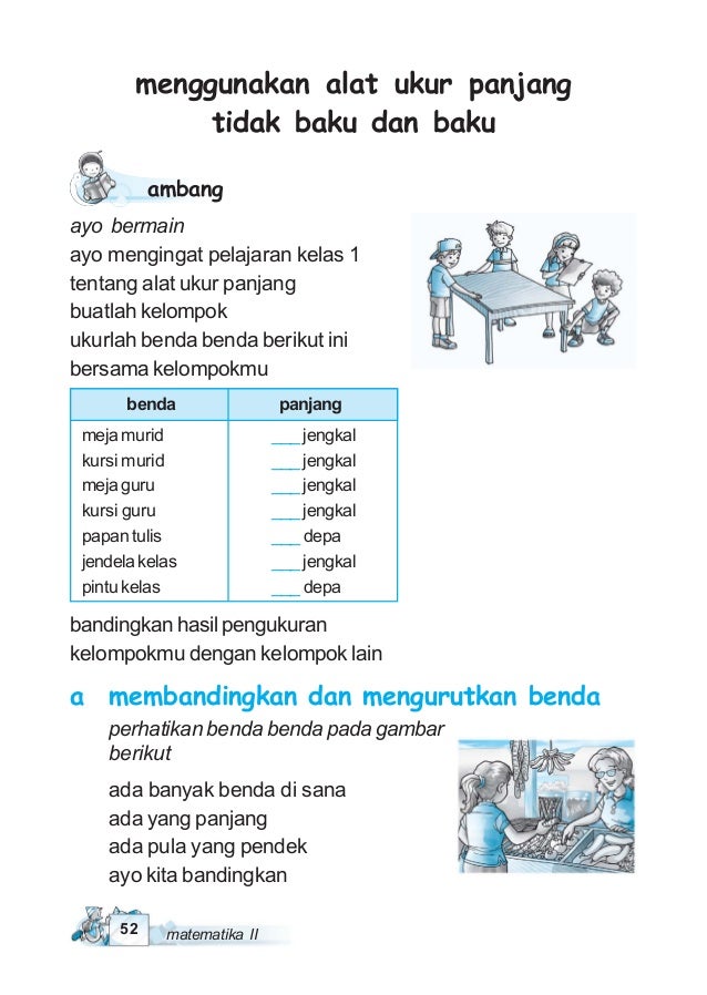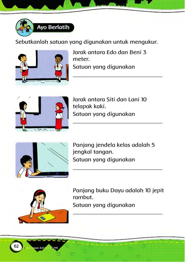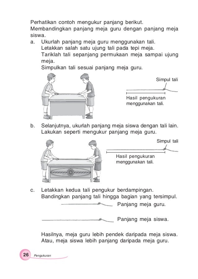 Misalnya anda mengukur panjang meja belajar dengan menggunakan jengkal dan mendapatkan bahwa panjang meja adalah 6 jengkal. Jawabannya adalah 4 meja. Ukurlah panjang meja di rumahmu.